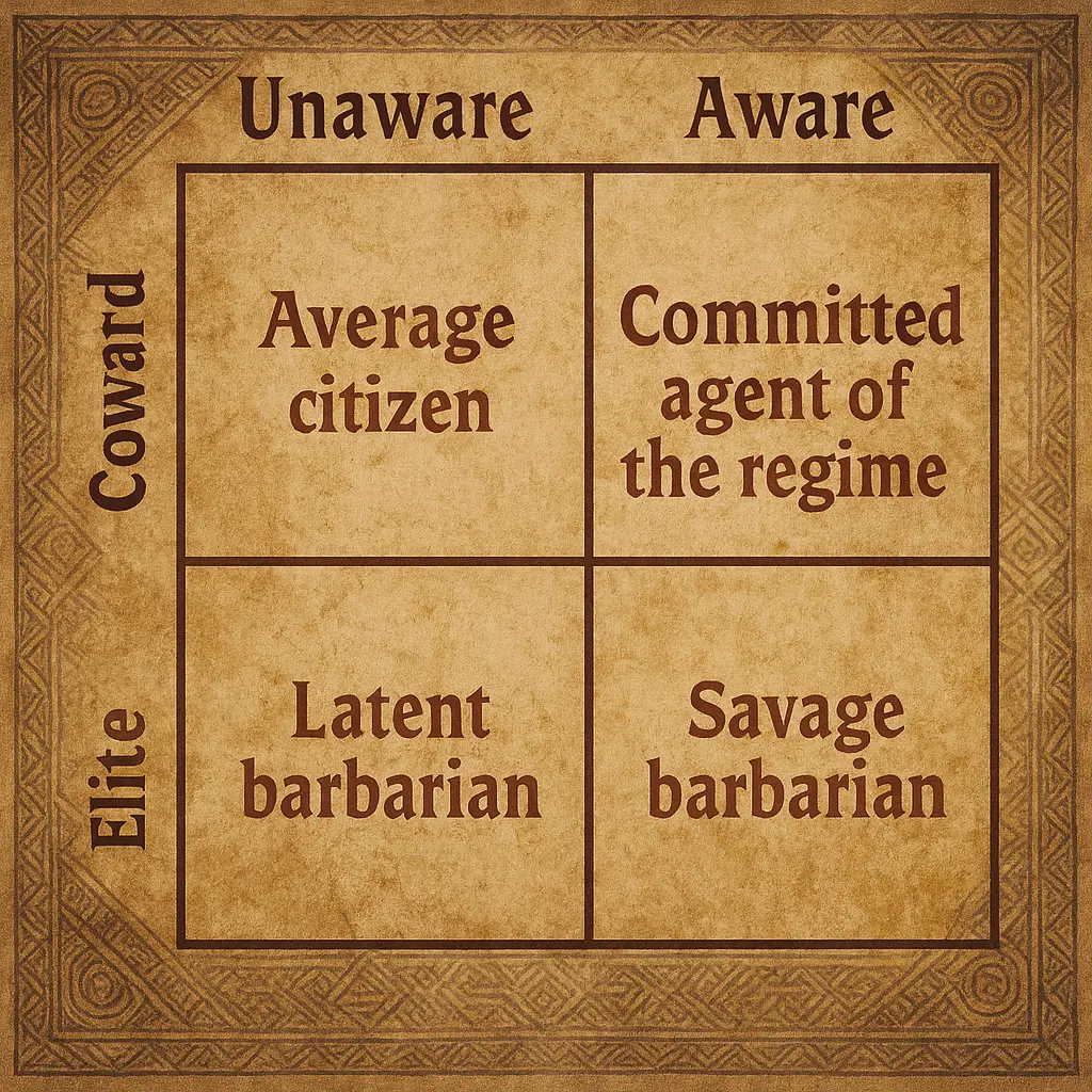 Average citizen - This unaware coward sells his soul, his future, and his family's future for every little comfort he can find. He will refuse to see reality if it counters the approved narrative. He will spend his days a slave in some small corner of the great panopticon maze. And he will think he is happy.